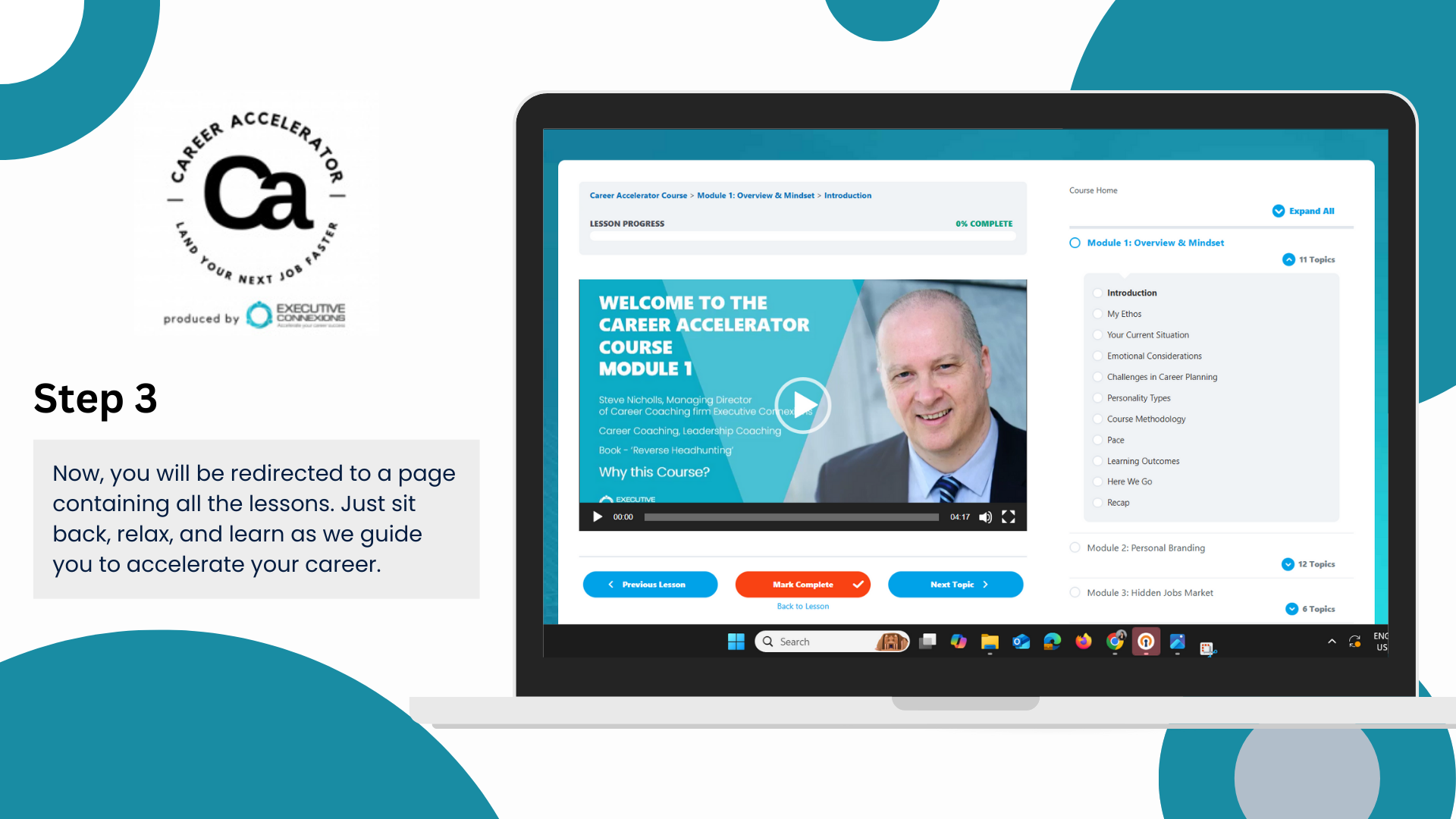 Start today to give your career a clear direction. With structured lessons, downloadable resources, and straightforward language, the Career Accelerator Course helps you move from intention to action, turning searching into finding and effort into opportunity. If you want a dependable way to advance your employment prospects, this course is built to deliver.